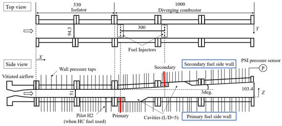 Figure 1 shows the schematic of the combustor with the axis definition. The flow path of the combustor included a 530 mm-long isolator and a 1000 mm-long diverging section. The cross-sectional area in the isolator was 51 mm × 94.3 mm, and that in the diverging combustor was increased to 103.4 mm × 94.3 mm at its exit following a half-expansion angle of three degrees. The primary injector was located at X = 581 mm (from the inlet of the isolator section) on the non-diverging side wall, and the secondary injector was located at X = 881 mm on the diverging side wall. The configuration of the fuel injector was 4 circular holes with a diameter of 3 mm vertical to the combustor wall. The spanwise intestinal between the fuel injection holes was 20 mm. The room-temperature fuel was injected at sonic speed into the combustor. In the diverging combustor, cavity flame holders were mounted behind the fuel injectors to improve the flame retention. When the hydrocarbon fuels were injected, pilot hydrogen about φ = 0.2 was injected to enhance the ignition of the hydrocarbon fuel. The pilot hydrogen fuel was then turned off before measurements.