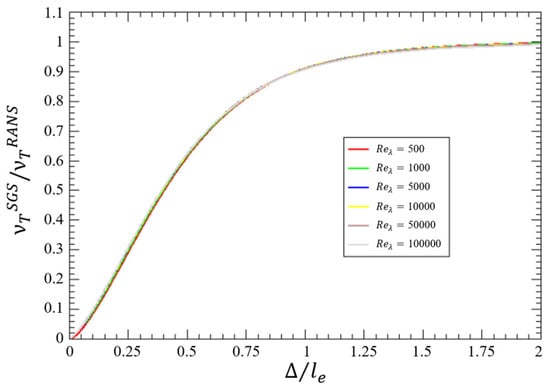 Plot of the ratio of SGS eddy viscosity to the total scale (RANS) eddy viscosity as a function of the resolution [5].