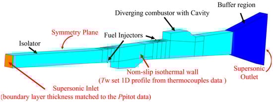 A computational grid was created using the commercial software Pointwise [12]. The used computational grid and the boundary conditions are shown in Figure 3. A multi-block structured grid was used for the simulations. The grid width at the first point off the wall was set to 2.0 × 10−7 m (y+ 1) in the simulations. The computational domain covered the region from X = 0 mm to 1300 mm, the domain exit being where the separation from the combustor exits due to over-expansion of the flow against the atmospheric pressure, which did not penetrate under the tare condition. After X = 1300 mm, a diverging duct with a rough grid density was connected as a buffer region to stabilize the calculation. Only half of the combustor flow path in the Y-direction was covered due to symmetry in the Y-direction. The grid sensitivity has been verified in an analysis using the RAN/LES hybrid method for a similar simulation of a supersonic reactive flow in the scramjet combustor, and the grid convergence of the using grid in the study has been confirmed [11]. The vit/vim ratio in the mainstream is less than 40 even in the strong turbulent vicinity in the pseudo-shock waves, so the grid resolution as LES simulations are reasonable.