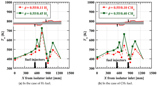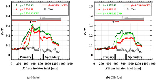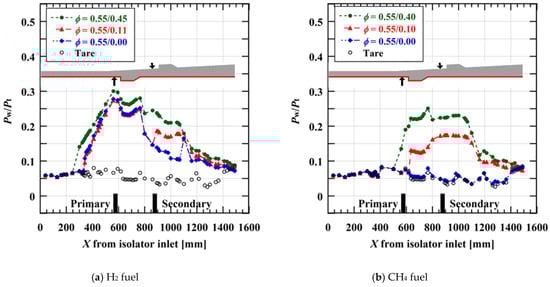 Figure 6 and Figure 7 show the wall pressure distribution in the high equivalent ratio case of the primary fuel with hydrogen and methane fuel, respectively. The wall pressure was normalized with the total pressure of the airflow at the isolator inlet.