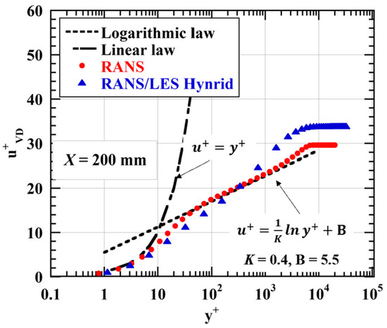 Figure 5 shows the non-dimensional velocity u+ profile in the turbulent boundary layer at the location of X = 200 mm cross-section plane. The non-dimensional velocity was van Driest transformed to consider the effects of the wall temperature of the compressible boundary layer [13]. Although the values of the RANS/LES hybrid calculation were roughly consistent to that of RANS, the values at the vicinity of edge of the boundary layer (y+ > 103) were higher than that of RANS. The effects of prediction accuracy of the turbulent boundary layer are discussed in the next section.