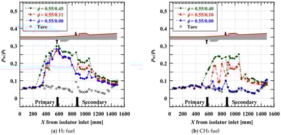 Comparison of pressure distributions on the secondary fuel side wall between (a) H2 and (b) CH4 fuels in the experimental results.