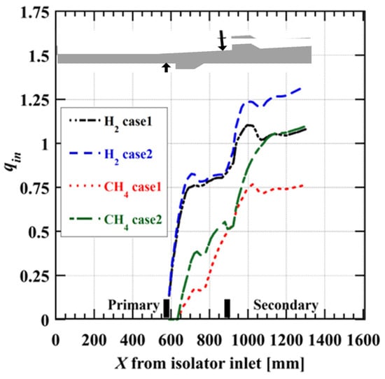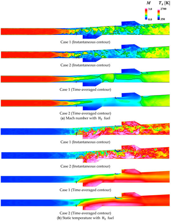 Figure 10 and Figure 11 show the instantaneous contours of the Mach number and static temperature by the CFD with H2 and CH4 injection in Case 1 and Case 2. Comparison of the Mach number contours indicated that the Mach number decreased in the vicinity of both fuel injectors. The boundary layer separation in the isolator spread wider and extended further upstream with the H2 injection than that with CH4 injection, due to the difference in the peak pressure. In the case of hydrogen, in Figure 10, the supersonic region was significantly shrunk, but supersonic condition was maintained around the upstream of the secondary injector in Case 1. In Case 1 with H2 injection, thermal choke occurred near the trailing edge of the first-stage cavity. Thus, the hydrogen fuel at the primary injector burned not only in the cavity but also in the mainstream to form the concentrated heat release near the first stage injector and cavity, resulting in the high peak pressure.