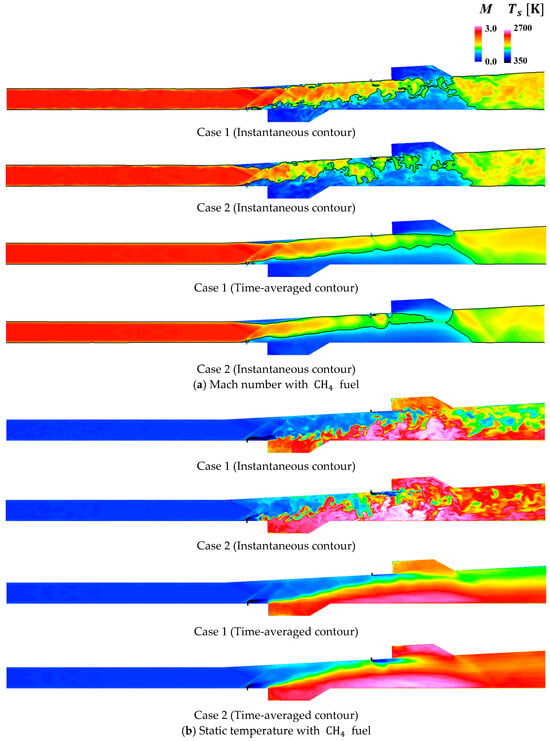 In the case of methane, in Figure 11, the mainstream supersonic flow was observed to be maintained up to the secondary injector in both Case 1 and Case 2. Methane fuel case, the primary fuel only burned in the cavity. The high-temperature region with methane fuel could be seen mainly around the secondary cavity. Methane fuel burns at relatively low temperatures in the secondary cavity than hydrogen fuel.