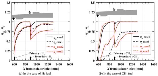 Comparison of cross-sectional mixing and combustion efficiency distributions in the case of (a) H2 and (b) CH4 fuels.