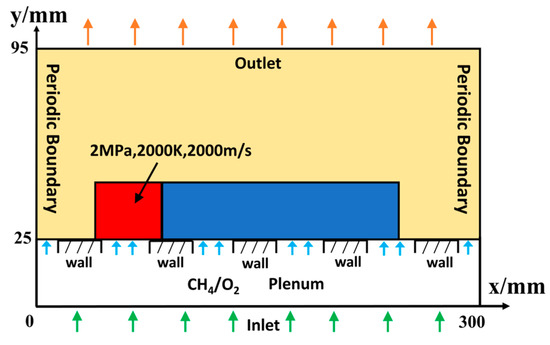 The two-dimensional calculation model of RDRE is shown in Figure 1. The total length in x direction is 300 mm, the total height in y direction is 95 mm, the height of the plenum is 20 mm, the height of the injection holes is 5 mm, and the height of the combustion zone is 70 mm. Since the reactants in the experiment are usually injected into the combustion chamber through small holes or slits, discrete injection holes were used to simulate the discrete distribution of the reactants in practice in this paper. The injection hole of the calculation domain is shown in Figure 1. The inlet boundary is alternatively distributed by both the inlet and the wall. The wall is the adiabatic slip boundary. The total number of injection holes is 60 and 120, with a consistent injection area. The ratio between the injection holes and the wall is ¼ . The patch method is adopted for detonation ignition, the specific location is shown in Figure 1. The size of the ignition region is 10 mm × 10 mm square, the ignition temperature is 2000 K, and the pressure is 2 MPa. At the same time, the ignition region is given at a speed of 2000 m/s in the x direction. The red and dark blue regions are filled with the premix CH4/O2 gas from the plenum, which is maintained at the pressure of 1 MPa and at the temperature of 300 K. The equivalent ratio is set according to the requirements of different cases. The gas composition in the yellow region is modified from CH4/O2 premixed gas to CO2/H2O premixed gas with a mass ratio of 1:1 by patch method. A non-reflecting pressure outlet boundary is applied at the outlet, where the conditions are set to the ambient temperature (300 K) and pressure (101,325 Pa). It should be noted that chemical reactions in the regions of injection holes and plenum are shut off to prevent flame flash back into the plenum.