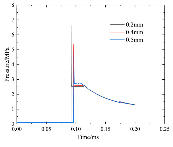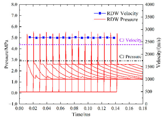 A 40 cm long two-dimensional detonation tube is numerically simulated and compared with the Chapman-Jouguet (C-J) theoretical velocity and theoretical temperature calculated by NASA CEA [42] to verify the reliability of the numerical method and the mesh size. Three mesh sizes of 0.2 mm, 0.4 mm, and 0.5 mm were used to verify the mesh resolution. The detonation tube is filled with methane-oxygen premixed gas with an equivalent ratio of 1, a gas pressure of 101,325 Pa and a gas temperature of 300 K. Figure 2 depicts the distribution of detonation pressure with three different grid resolutions. The distribution of pressure drop in the three grids is basically the same, which means that the grid resolution has been reasonably converged. Therefore, a mesh size of 0.4 mm is used in numerical simulation to ensure the calculation accuracy and save the calculation resources. Figure 3 shows the distribution of detonation wave pressure and velocity at different times with 0.4 mm grid. In this study, the propagation velocity and the temperature of detonation wave are 2659 m/s and 3958 K, the C-J theoretical velocity is 2390 m/s with an error of 11% and the C-J theoretical temperature is 3721 K with an error of 6.4%. The results show that the simulation results are in good agreement with the C-J theoretical value calculated by NASA CEA. Due to the high activity of oxygen as an oxidizer, the simulation results are acceptable in this paper and the reliability of the numerical method in this study can be verified from C-J velocity and C-J temperature. The method proposed in this paper is suitable for the two-dimensional numerical study of methane-oxygen detonation in compressible reactive fluids.