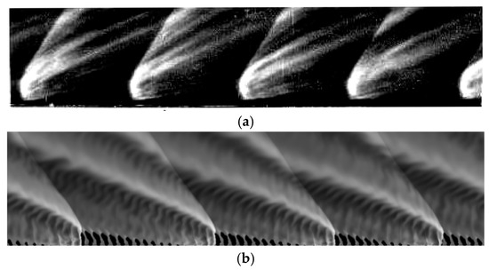 Comparison of numerical and experimental flow field. (a) Flow field structure of propane-oxygen RDE captured by Bykovskii et al. [10]. (b) Numerical flow field structure of RDRE in this study.