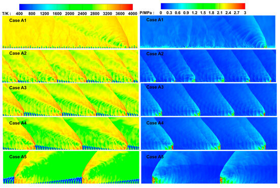 When the number of injection holes is 60, two RDRE detonation flow field structures appear: the hybrid detonation mode with a large amount of deflagration in case A1 and the co-directional multi-wave mode in the other cases. As shown in Figure 5, the temperature and static pressure contours of RDRE flow field from top to bottom are case A1~A5. Since the flow field of the plenum and injection holes is not the focus of research, it is not discussed in this study.