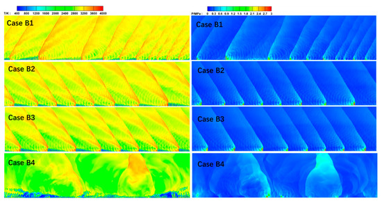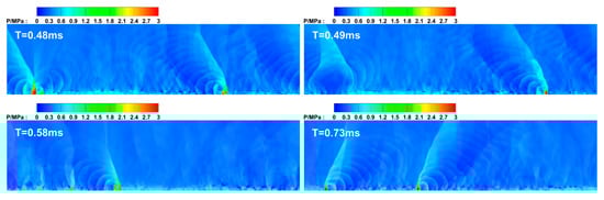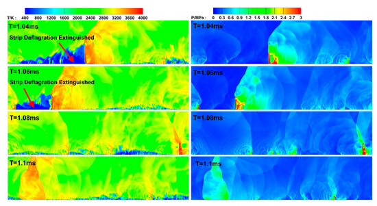 When the number of injection holes is 120, CMM and UDM appear as shown in Figure 9. Figure 9 is the temperature and pressure contours of Cases B1~B4. The flow field structure in CMM will not be discussed. For UDM, take case B4 as an example, the flow field is in the state of unstable detonation propagation. As shown in Figure 10, in the unstable propagation mode, the number of detonation waves in the flow field is lower, the height of the reactant filling zone is higher, the distribution of detonation waves in the flow field is irregular, and linear oblique shock waves are not formed due to the impact of detonation wave collisions. When the detonation wave collides at t = 1.1 ms, the weaker detonation wave is decoupling and reburning after the collision, repeating the process of detonation wave collision, initiation, and annihilation, resulting in the unstable propagation mode of RDRE, Yao et al. [24] and Xia et al. [47] also observed a similar reinitiation phenomenon. The heat accumulated in small deflagration region is insufficient to induce the formation of RDW in the condition of low reactant activity, and even the deflagration in some areas disappears, such as the filling zone of the detonation wave front at t = 1.04 ms. The unsteady propagation mode eventually leads to the uneven distribution of temperature and pressure in the flow field and the uneven expansion of combustion products.