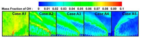 Figure 8 shows the local OH distribution contour of Case A1~A5. There is a qualitative positive correlation between the concentration of OH and the heat release rate, and the mass fraction of OH represents the magnitude of reaction intensity and heat release rate [45,46]. It can be clearly found that a large amount of deflagration occurs after fuel injection under condition A1. A large amount of OH was distributed around the injection holes and in the whole chamber. For the remaining cases, the OH mass fraction in the detonation wave front and post-wave regions decreases with the increase of the equivalent ratio, and the OH distribution is concentrated in the detonation wave and oblique shock wave regions, indicating that the decrease of deflagration ratio in RDRE and post-detonation wave region. The decrease in reactant activity leads to the decrease in heat release rate and intensity of detonation combustion, reduces the probability of inducing new detonation wave formation, reduces the number of detonation waves, and increases the proportion of reactant used for detonation. In general, the decrease in reactant activity will lead to a decrease in the number of detonation waves in the RDRE and an increase in the height of the reactant filling zone, thus affecting the flow field structure in the RDRE.