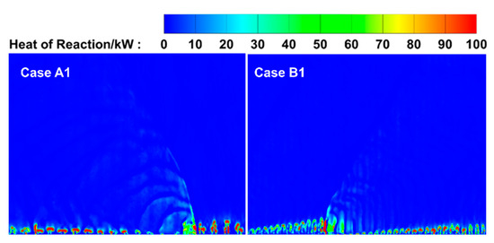 Different from case A1, case B1 does not operate in hybrid detonation mode. Figure 11 shows the contours of reaction heat in Case A1 and B1. It can be observed that a large amount of deflagration consumes reactants under the condition of high reactant activity, resulting in the accumulation of a large amount of reaction heat. It is known that hotspots easily form detonation wave under conditions of high reactant activity. However, excessive consumption of reactant during deflagration results in insufficient energy for the stable propagation of detonation waves [43,44], ultimately leading to unstable propagation.