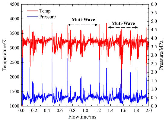 The above research indicates that the equivalent ratio has a significant influence on the flow field of RDRE, thereby exerting a substantial impact on the propagation characteristics of RDW. Figure 12, Figure 13 and Figure 14 illustrate the temporal evolution of static pressure and temperature at the sampling point of the RDRE (x = 90 mm, y = 28 mm). Figure 12 shows the temperature and static pressure history diagram of case A1. The static pressure and temperature curve shows that the propagation mode of condition A1 is in the single wave/multi-wave conversion mode. The arrows in the figure indicate the multi-wave region, where the single wave/multi-wave conversion is continuously carried out in the flow field. The reason for this chaotic pattern [48] is that hotspots around the reactants will lead to the formation of new detonation waves, while there are not enough reactants to maintain the intensity and propagation of the detonation waves, resulting in constant decoupling and re-initiation of the detonation waves. In addition, discrete injection holes will generate multiple reflected waves after the detonation wave, and stronger reflected waves may also be transformed into detonation waves [35,49]. According to previous studies, when the equivalent ratio is 1, the reactant activity is the largest, and a large number of hotspots near the injection holes can induce the formation of new detonation waves, but there are not enough reactants to maintain the stable propagation of detonation waves, and it is impossible to convert from chaotic mode to stable detonation propagation mode. Therefore, the HDM is an unstable propagation mode. Under the condition of 60 injection holes, a stable multi-wave propagation mode is formed. Except for case A1, the number of detonation waves in other stable propagation conditions shows a downward trend, and the time required to form a stable detonation mode is relatively similar. Meanwhile, the peak temperature and pressure of detonation wave are less affected by the changes in equivalent ratio. The peak temperature of detonation wave is around 3900 K, and the peak static pressure of the RDW is around 2 MPa.