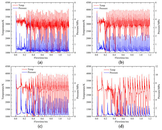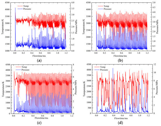 Pressure and temperature history diagram of cases B1~B4. (a) Case B1. (b) Case B2. (c) Case B3. (d) Case B4.
