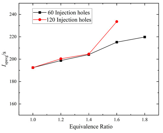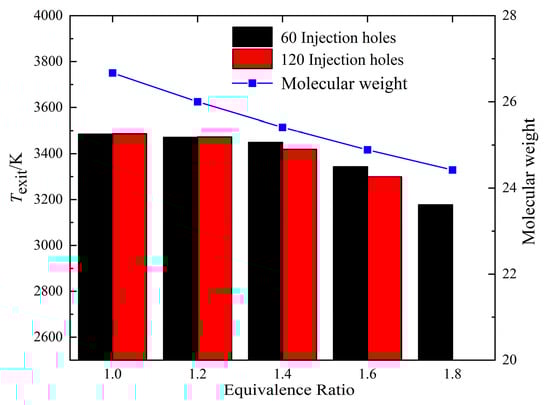 In order to eliminate the influence of the ignition stage, the data between 0.8 ms and 1.2 ms after the ignition were averaged in this paper. Figure 15 shows the average specific impulse (Ispavg) under different ER. When the number of injection holes is 60, the equivalent ratio increases from 1.0 to 1.8, and Ispavg increases from 192 s to 220 s by 14.6%. When the number of injection holes is 120, the equivalent ratio increases from 1.0 to 1.4 and from 192 s to 205 s, and the Ispavg of Case B4 under the unsteady detonation propagation mode is 237 s, but it has no reference value. The overall results show that when the equivalent ratio is between 1.0 and 1.8, the Isp of RDRE increases with the increase of the equivalent ratio. We know that rocket engines can increase the specific impulse by increasing the gas temperature or decreasing the propellant molecular weight [50]. RDRE is consistent with conventional rocket engines, and the operating range of RDRE is different from ramjet RDE which is under lean fuel equivalent ratio. Figure 16 shows the average exit total temperature (Texit) and molecular weight of the reactants (Mmolar) of RDRE. The results demonstrate a decrease in Texit and Mmolar with an increase in the equivalent ratio.