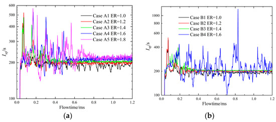 The curves of Isp under different equivalent ratios are presented in Figure 17, exhibiting a significant oscillation during the initiation stage, which is caused by the blockage of part of the injection holes by irregular detonation waves that lead to the instability of inlet mass flow rate in the initiation stage. However, once the multi-wave stable propagation mode is reached, co-directional and regular RDWs have little effect on the blockage of injection holes and the specific impulse curve becomes stable. Under the condition of high equivalent ratio, case B4 experiences an unstable detonation mode leading to substantial oscillations in specific impulse. This instability arises due to variations in quantity, direction, and intensity of detonation waves and oblique shock waves within the RDRE flow field at different times during unstable detonation propagation mode, resulting in irregular and uneven gas expansion. Similarly, case A1 with a detonation-deflagration mixing mode also exhibits an unstable propagation mode with greater oscillation amplitude compared to other cases with 60 injection holes.