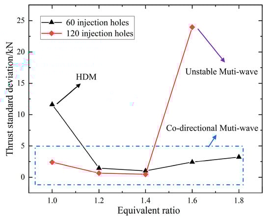 Figure 18 shows the standard deviation of thrust under different equivalent ratios between 0.8 ms and 1.2 ms after ignition. Standard deviation of thrust reflects the deviation degree between instantaneous thrust and average thrust. The thrust standard deviation of RDRE under unstable detonation propagation is greater than that under stable detonation propagation. In general, the thrust of RDRE is more stable in CMM, detonation waves are evenly distributed in RDRE and the spacing between oblique shock waves is uniform. The expansion of combustion products after oblique shock waves is more uniform and regular, thus generating more stable thrust. Combining the specific impulse and the stability of thrust, RDRE should be maintained in a state of co-directional multi-wave stable propagation to achieve more stable thrust within the range of the equivalent ratio where maximum specific impulse can be attained.