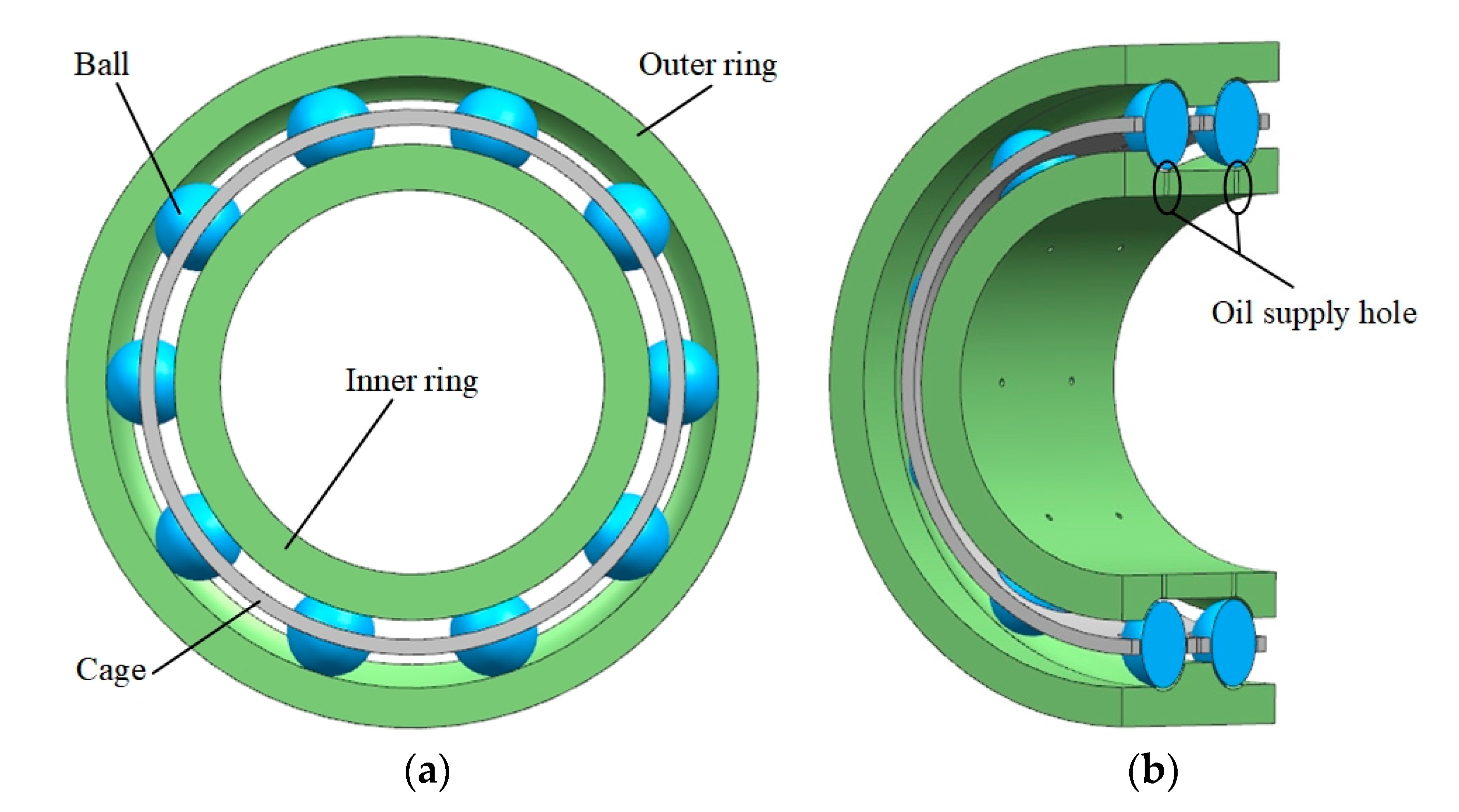 - Qian, S.K.; Wang, B.M.; Du, X.B.; Chen, X. Lubrication enhancement of high-speed angular contact ball bearings by adding diversion hole in cage. J. Braz. Soc. Mech. Sci. Eng. 2025, 47, 164. [Google Scholar] [CrossRef]