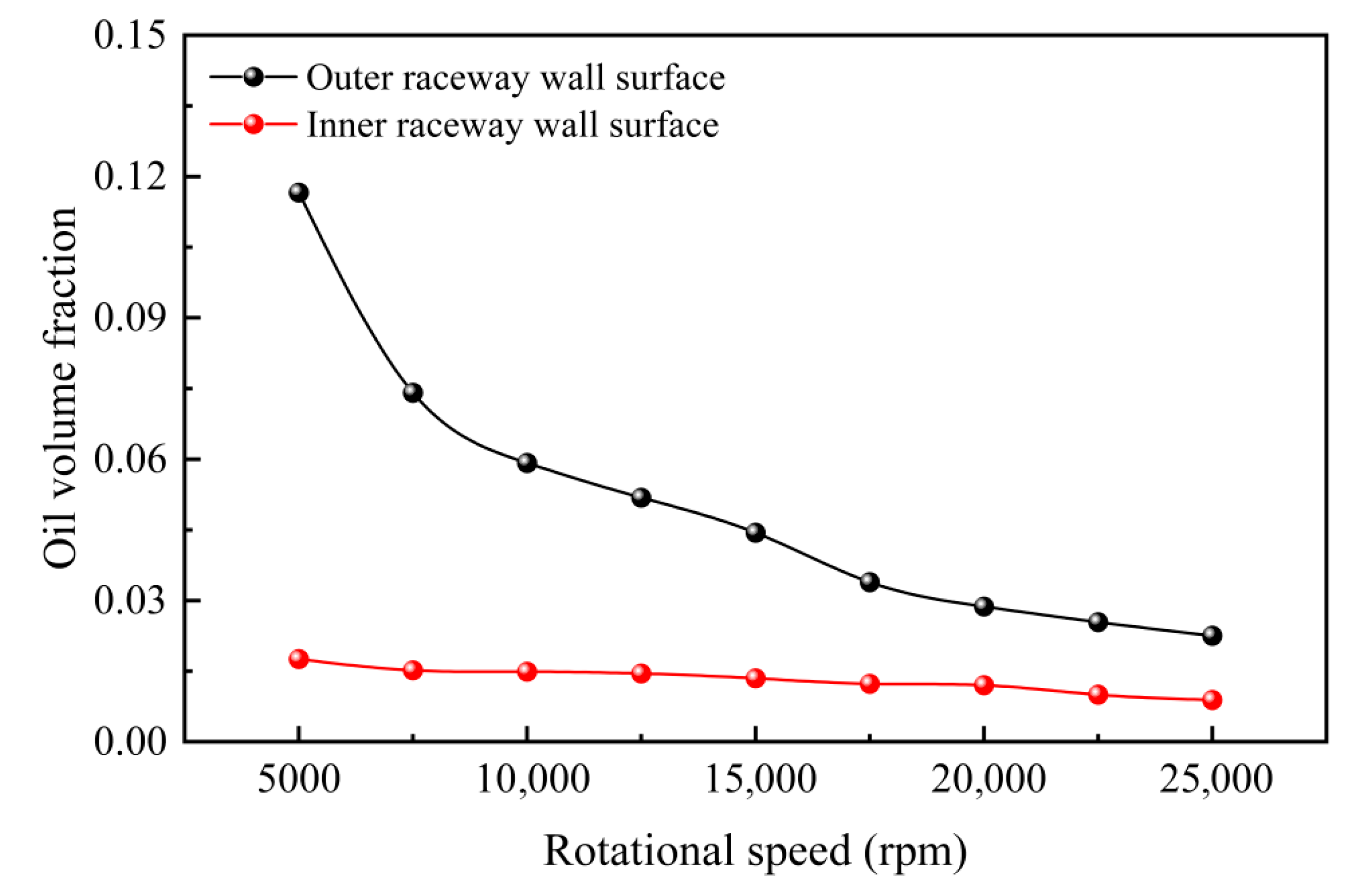 - The self-rotation of balls reduces the overall oil volume fraction within the bearing cavity, causing a substantial decrease in the outer raceway’s oil volume fraction while markedly increasing that of the inner raceway. The self-rotation effect is particularly prominent at low rotational speeds, whereas it becomes negligible at high rotational speeds. This indicates that the self-rotation of balls is a critical factor requiring special attention under low-speed operating conditions, and its coupling effect with rotational speed directly determines the lubrication performance.