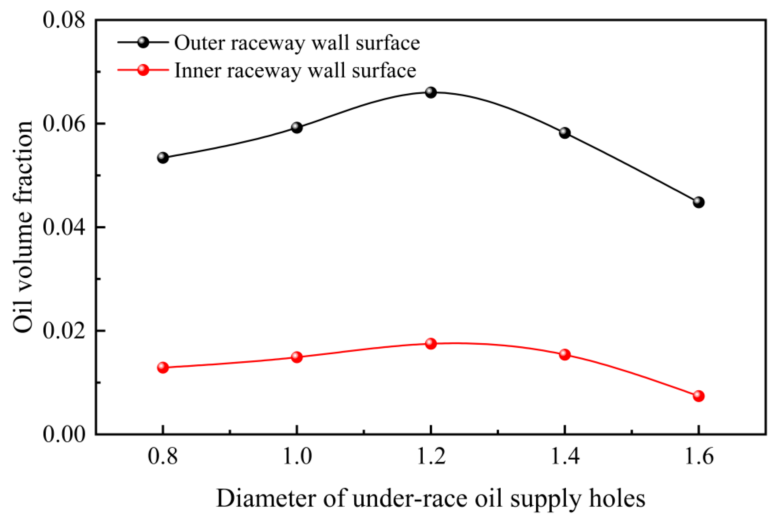 - Compared with single-sided oil supply structures, double-sided oil supply structures exhibit higher circumferential oil volume fractions. Changes in the circumferential position of under-race holes do not alter the overall oil distribution within the bearing cavity. Increasing the number of under-race holes simultaneously enhances the oil volume fractions on both the inner and outer ring surfaces. However, the influence of oil supply hole diameter on the volume fraction follows a “first-increase-then-decrease” trend, with an optimal diameter existing. Therefore, synergistic optimization of the oil supply structure and parameters (number and diameter) is required in under-race lubrication design to improve lubrication uniformity.