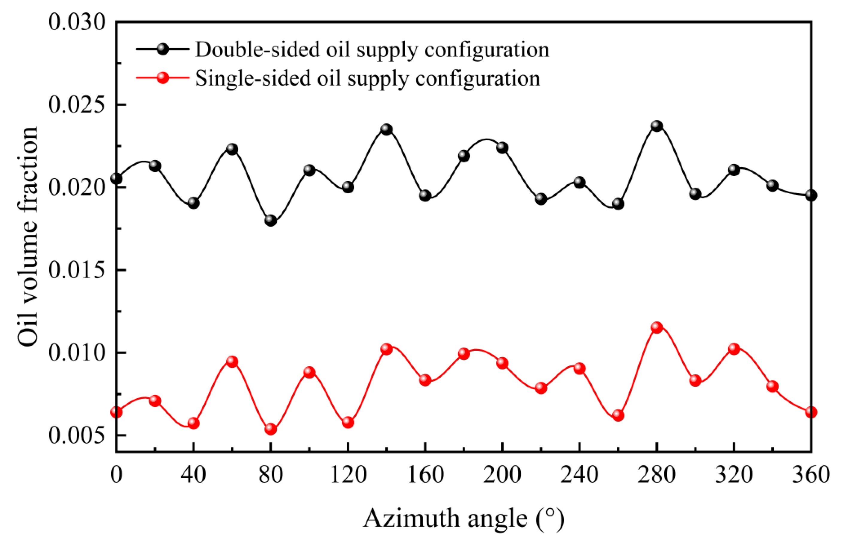 - The oil distribution inside the bearing is dominated by centrifugal force, exhibiting asymmetric characteristics with oil enrichment at the outer ring and depletion at the inner ring (the average volume fraction on the outer ring surface is significantly higher than that on the inner ring). Circumferential oil distribution exhibits periodic variations synchronized with the number of under-race holes. Additionally, oil concentration is higher near the under-race holes and lower in regions farther away from them.
