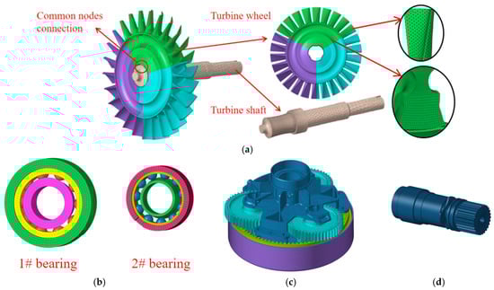 Finite element models of rotating components: (a) turbine rotor; (b) bearings; (c) planetary gear; (d) output shaft.