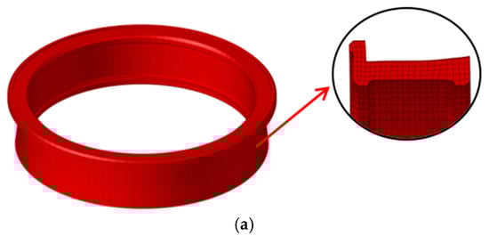 The Johnson–Cook model is selected as the material model for the contact components because it considers the effect of the strain rate on the material. The Johnson–Cook constitutive relation [] is expressed as follows: