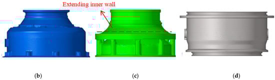 The finite element models of the containment components are shown in Figure 3, including the containment ring, intake casing, exhaust casing, and decelerator casing. To simulate the containment process more effectively, at least two mesh layers are established in the thickness direction of the containment component. The containment ring is meshed using hexahedral elements, and four mesh layers are established in the thickness direction. The intake and decelerator casings are meshed with tetrahedral elements. The extending inner wall of the exhaust casing is an important structure for withstanding the impact load of the wheel, and, thus, the inner wall of the exhaust casing is meshed using hexahedral elements, whereas the remainder of the exhaust casing is meshed using tetrahedral elements.