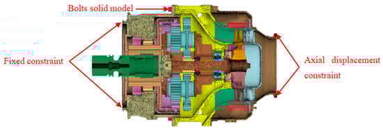 The finite element model of the entire ATS is shown in Figure 4; the number of elements is 1,741,112. In an actual installation, the intake casing is connected to the rigid air intake pipe by a clamp; therefore, an axial displacement constraint is applied to the flange of the intake casing. The decelerator casing is connected to the aero-engine accessory gearbox by a clamp; therefore, a fixed constraint is applied to the flange of the decelerator casing. The intake, exhaust, and decelerator casings are connected using nine long bolts. A solid model of the bolt is adopted because this model can fully reflect the bolt deformation and the interaction between the bolt and hole []. An automatic single-surface contact is defined between the bolt cylinder surface and the bolt hole. A free boundary is adopted for the containment ring. An automatic single-surface contact and global eroding contact is defined for the contact components. The dynamic process time for the impact calculated by the simulation is set to 2 ms, which is sufficient to capture the complete process of impact following the burst of the turbine wheel [].