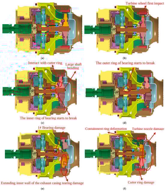 Process of the turbine. Wheel pieces impacting the containment ring at t = (a) 0.00; (b) 0.03; (c) 0.15; (d) 0.30; (e) 0.42; and (f) 1.35 ms.