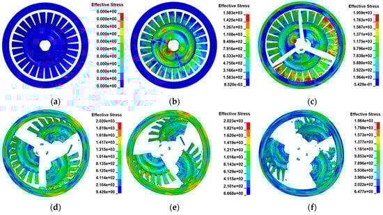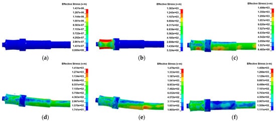 Damage and deformation processes of the turbine shaft at t = (a) 0.00; (b) 0.03; (c) 0.15; (d) 0.30; (e) 0.42; and (f) 1.35 ms.