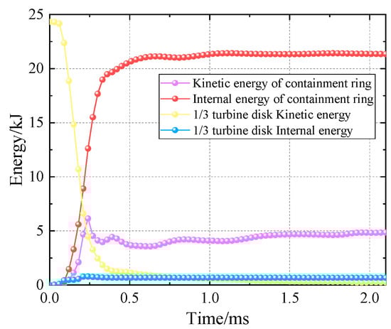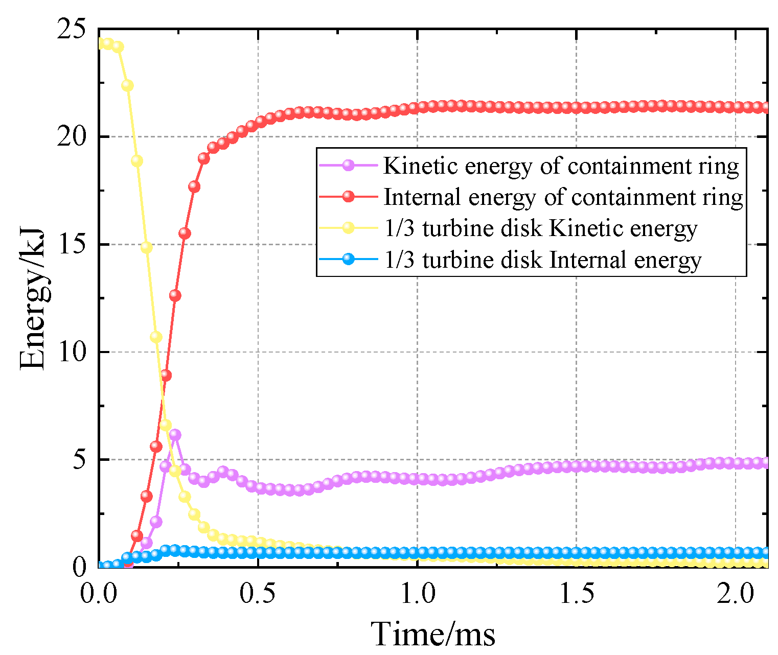 Figure 7 shows the various energy change processes of the turbine disk and the ring. As shown in the figure, the energy changes rapidly within t = 0 to 0.48 ms. After t = 0.48 ms, the energy of each component basically remained unchanged, and the shock process came to an end. In the numerical simulation, the kinetic energy of 1/3 turbine disk before and after impact was Ea = 23.6 kJ and Ek = 1.19 kJ, respectively, with a decrease of 94.96% in kinetic energy. The energy absorbed by the retaining ring is Ec = 22.41 kJ. Obviously, the vast majority of the kinetic energy of the wheel fragments is absorbed by the containment ring, thus achieving the containment effect.