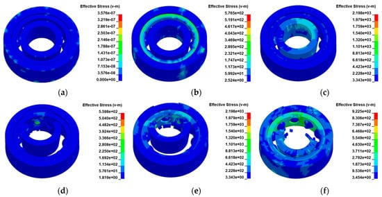 Damage and deformation processes of the bearing near the turbine wheel at t = (a) 0.00; (b) 0.03; (c) 0.15; (d) 0.30; (e) 0.42; and (f) 1.35 ms.
