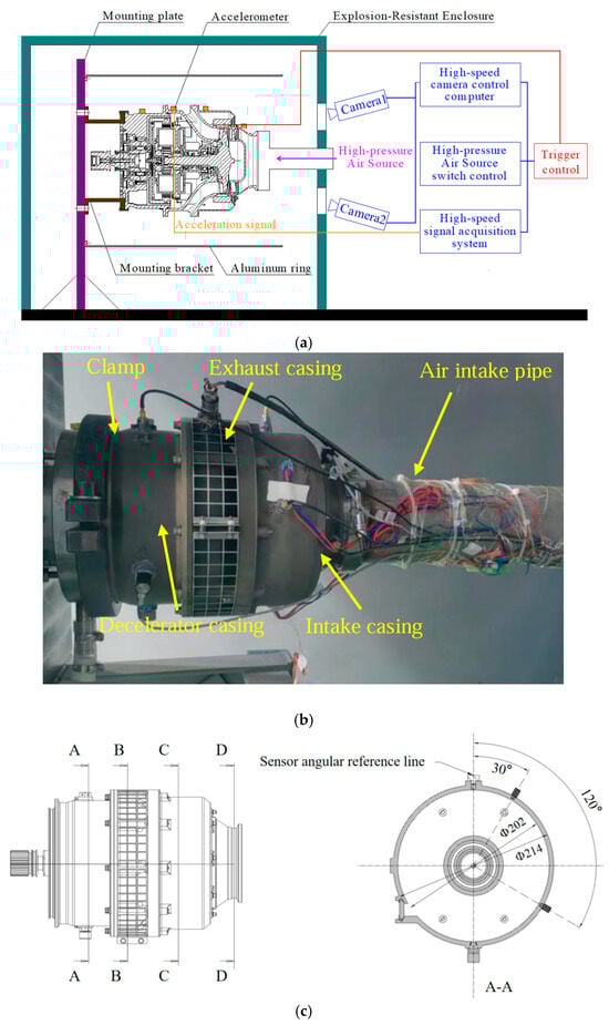 An ATS containment test platform is established based on the ATS containment experimental design, as shown in Figure 10. In accordance with the actual installation of the ATS on the aero-engine, the flange of the decelerator casing is connected to a mounting bracket through a clamp; the mounting bracket is connected to a mounting plate using bolts. The intake casing is connected to a high-pressure gas source pipe. To observe the damage caused by flying pieces to components near the ATS, an aluminum ring is installed around the ATS. On both the left and right sides of the intake pipe, two inspection windows are installed in the wall of the explosion-resistant enclosure, and two high-speed cameras are placed at the same horizontal height to obtain a full view of the enclosure. A total of six radial acceleration sensors are installed on the casings, which are arranged as follows: one sensor (#1) on the decelerator casing (located in section A-A), two sensors (#2 and #3) on the exhaust casing (located in section B-B), two sensors (#4 and #5) on the intake casing at the radial position corresponding to the containment ring (located in section C-C), and one sensor (#6) on the intake casing at the position of the inflow (located in section D-D). Using the axis of the bolt at the top of section A-A as the angular reference line, in the section where only one sensor is placed, the sensor is located at a phase angle of 30°, whereas in the section with two sensors, the sensors are located at phase angles of 30° and 120°.