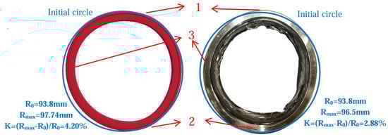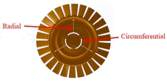 where Rw is the radius of the turbine wheel. To break the turbine wheel simultaneously along the radial and circumferential directions, the stresses should be similar at the radial and circumferential slot edges. Combining the stress calculation and Equation (9) yields a circumferential slot angle θ = 90° and radial slot length L = 30.3 mm.
