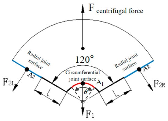 The force situation of a regular trisection wheel piece with a uniform cross-section is shown in Figure 12. The centrifugal load of the wheel piece is expressed as follows: