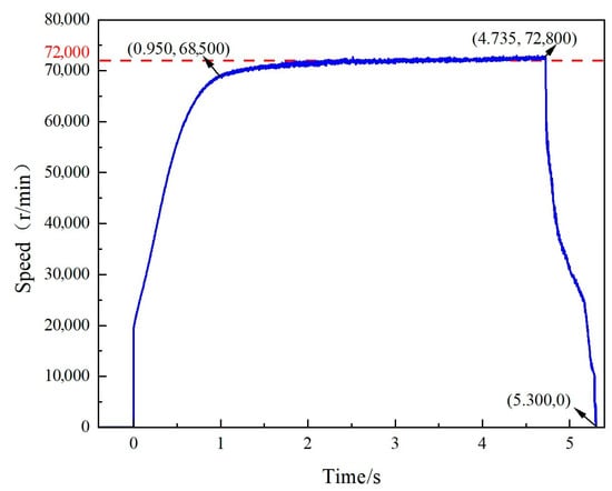 Figure 13 is the rotational speed versus time curve. Figure 12 shows that, initially at t = 0 ms, the airflow initiates turbine rotation, and the rotational speed increases rapidly under the power of the airflow. Between t = 0 and 0.95 ms, the turbine speed increases rapidly to 68,500 r/min. Subsequently, the speed increases slowly between t = 0.95 and 4.74 ms until it reaches the wheel-burst value (72,800 r/min), at which point the wheel bursts, and the wheel pieces impact the containment ring and cut off the trigger wire, sending a signal to the control system to halt the airflow. In this process, oscillations occurred due to the airflow driving the turbine. Between t = 4.74 and 5.30 ms, the speed rapidly drops to 0 r/min, and the turbine shaft stops rotating. Figure 12 also shows that the error between the experimental speed (72,800 r/min) and the design speed (72,000 r/min) is 1.1%, confirming the validity of the turbine wheel cutting method.