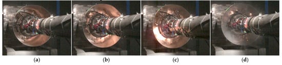 After the burst of the turbine wheel, the pieces and sparks generated by the impact on the containment ring, turbine nozzle, intake casing, and aluminum ring overflow from the exhaust port, as shown in Figure 14. Figure 14 shows that as the turbine wheel first starts to burst, weak sparks appear owing to the impact. Subsequently, a large number of sparks appear, and some pieces are ejected instantly, indicating that the turbine wheel pieces have already begun to impact the containment ring. Next, numerous pieces impact the aluminum ring, generating large amounts of sparks. Finally, the number of sparks gradually decreases, and a large amount of dust is generated. At this point, the impact process is complete, and the aluminum ring is not broken. Based on the sequence of sparks generated at the different circumferential angles, the three turbine wheel pieces can be inferred to be ejected at different times. Therefore, setting different ejection times for the turbine wheel pieces in the simulation is reasonable.