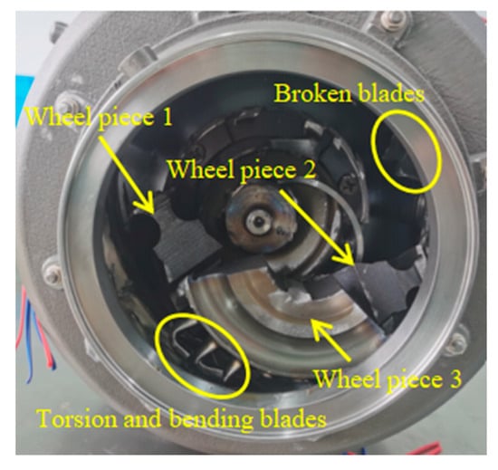 Figure 15 is the damage to the turbine wheel after removing the air intake pipe. Figure 15 shows that the turbine wheel bursts into three pieces, and the blades in the turbine wheel are broken. Notably, all of the pieces are located in the ATS.