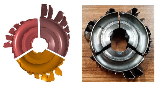 To cause a trisection turbine wheel burst at the designed speed, a turbine wheel cutting method is proposed. Radial and centrifugal slots are cut in the turbine wheel, as shown in Figure 11.