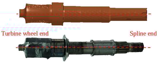 The damage and deformation processes of the shaft during the simulation are shown in Figure 8. Figure 8 shows that under the large unbalanced loads caused by the wheel burst, the shaft head sways, causing visible bending deformation of the turbine shaft. Simultaneously, the connecting surface between the turbine wheel and shaft is pulled by a large centrifugal load and is thereby broken to form a rough surface.