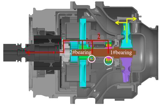 (3) The starter exhibited two primary load transfer paths. Path 1 is responsible for containing high-energy pieces from the burst wheel, while Path 2 resists the large unbalanced load generated during the burst process and transmits it to the casings and output components. For Path 1: the centrifugal impact load from the wheel burst is first transferred to the extended inner wall of the exhaust casing; a portion of this load is then transferred to the outer wall of the exhaust casing, while the majority is transferred to the containment ring, and subsequently to the turbine nozzle and intake casing via bolts and flanges, successively. For Path 2: the unbalanced load induced by the wheel burst on the shaft is mainly transferred to the planetary gear set through two bearings, then transmitted to the clutch assembly via a rotating transmission structure, and finally transferred to the output shaft through the clutch assembly.