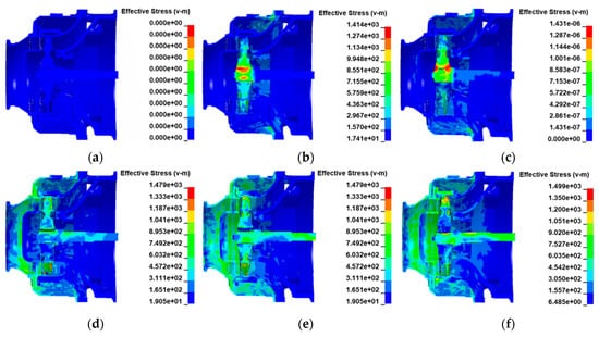 Stress distribution in the structures of load transfer path 1 at t = (a) 0.00; (b) 0.03; (c) 0.06; (d) 0.09; (e) 0.12; and (f) 0.15 ms.