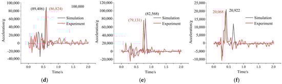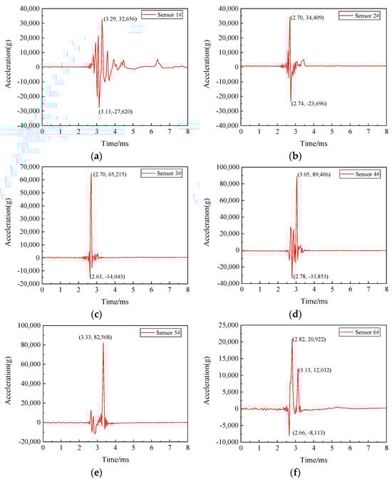 Acceleration versus time curves for the casings: acceleration sensor (a) #1; (b) #2; (c) #3; (d) #4; (e) #5; and (f) #6.