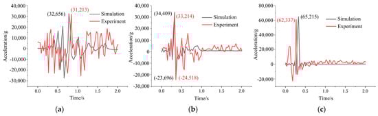 The simulation and experimental comparison of ATS vibration response are shown in Figure 24. Taking the simulation time of 2 ms as the time axis, the vibration signals extracted on the time axis of 2.5 ms to 4.5 ms were tested. The comparison results are shown in Figure 24. The results show that the vibration response trends of the key parts obtained through simulation and experiments are basically consistent, and the peak error of the vibration response is within 2.9% to 4.7%, as show in Figure 24.