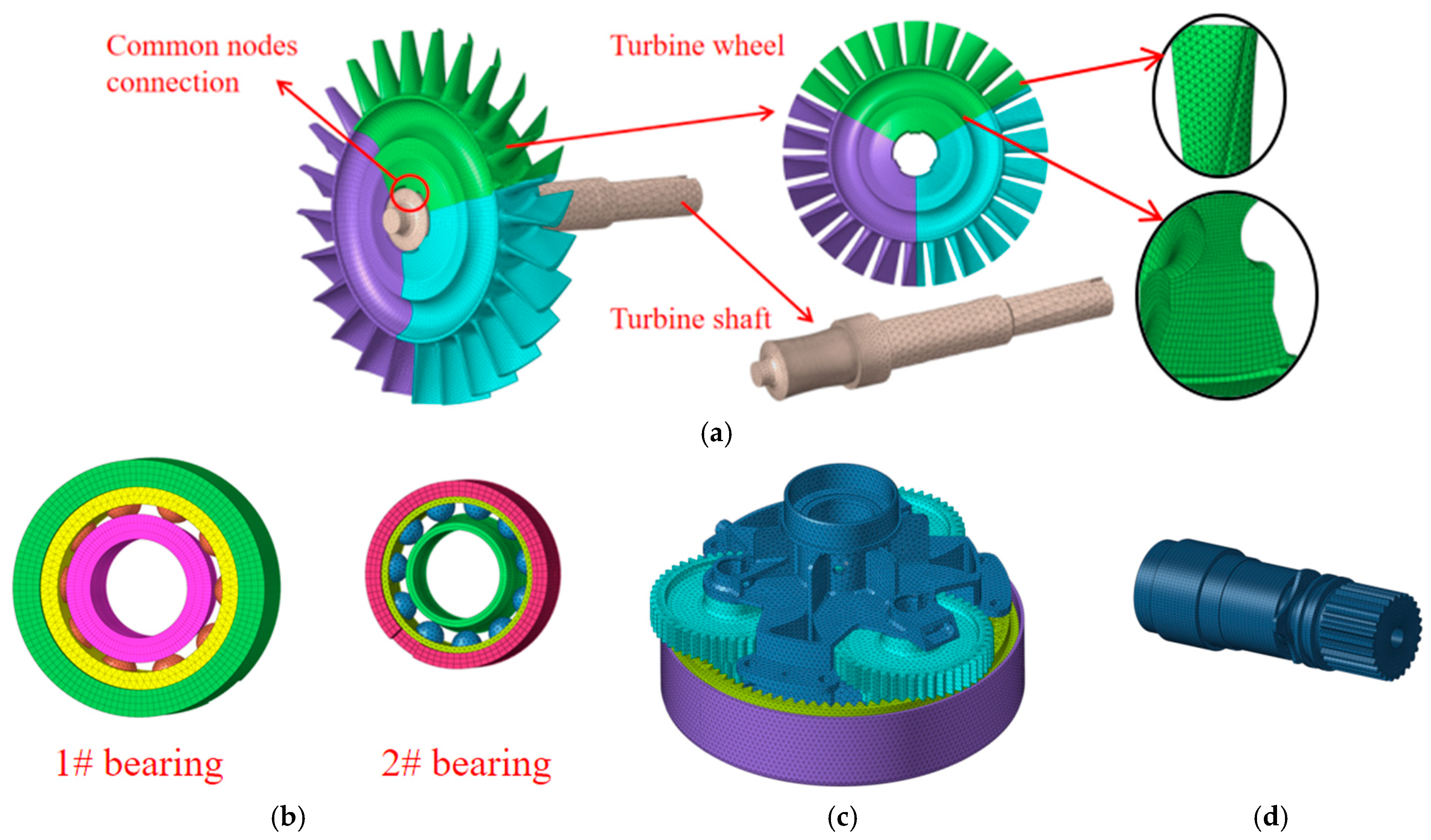 The finite element models of the rotating components, including the turbine wheel, turbine shaft, bearings, planetary gear, and output shaft, are shown in