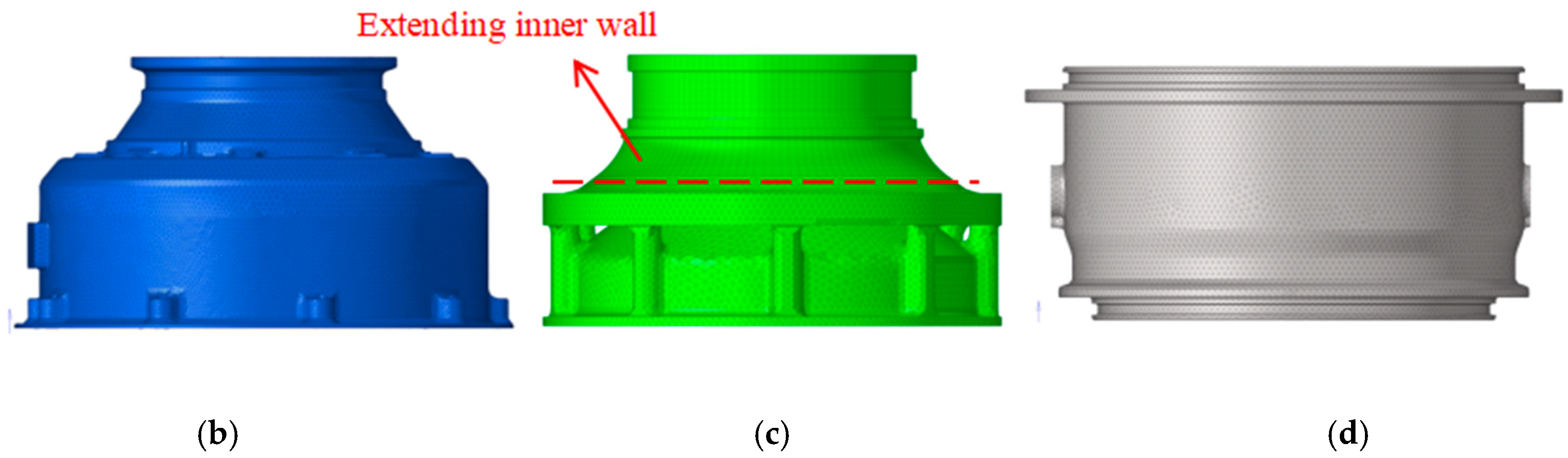 Figure 3, including the containment ring, intake casing, exhaust casing, and decelerator casing. To simulate the containment process more effectively, at least two mesh layers are established in the thickness direction of the containment component. The containment ring is meshed using hexahedral elements, and four mesh layers are established in the thickness direction. The intake and decelerator casings are meshed with tetrahedral elements. The extending inner wall of the exhaust casing is an important structure for withstanding the impact load of the wheel, and, thus, the inner wall of the exhaust casing is meshed using hexahedral elements, whereas the remainder of the exhaust casing is meshed using tetrahedral elements.
