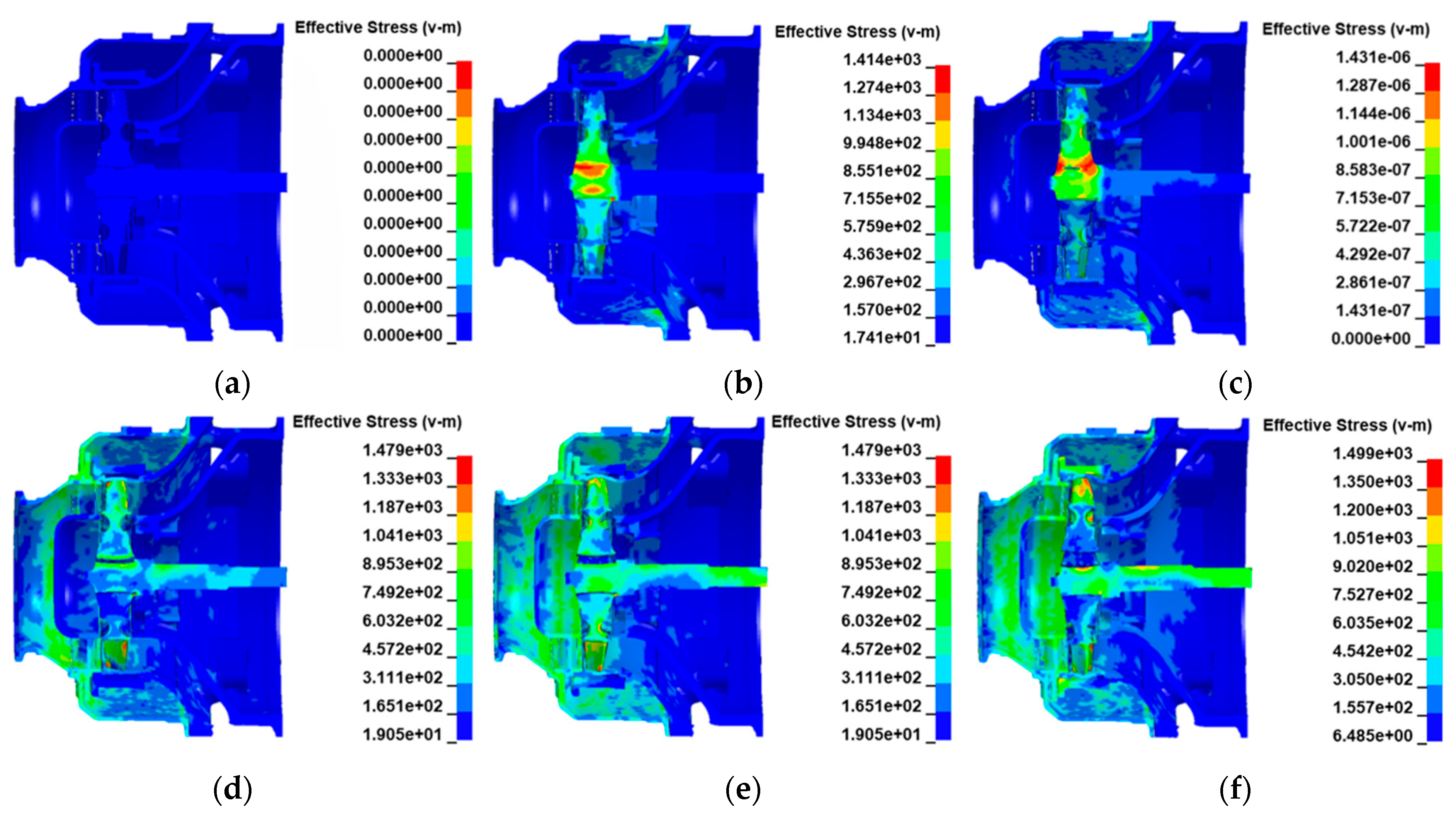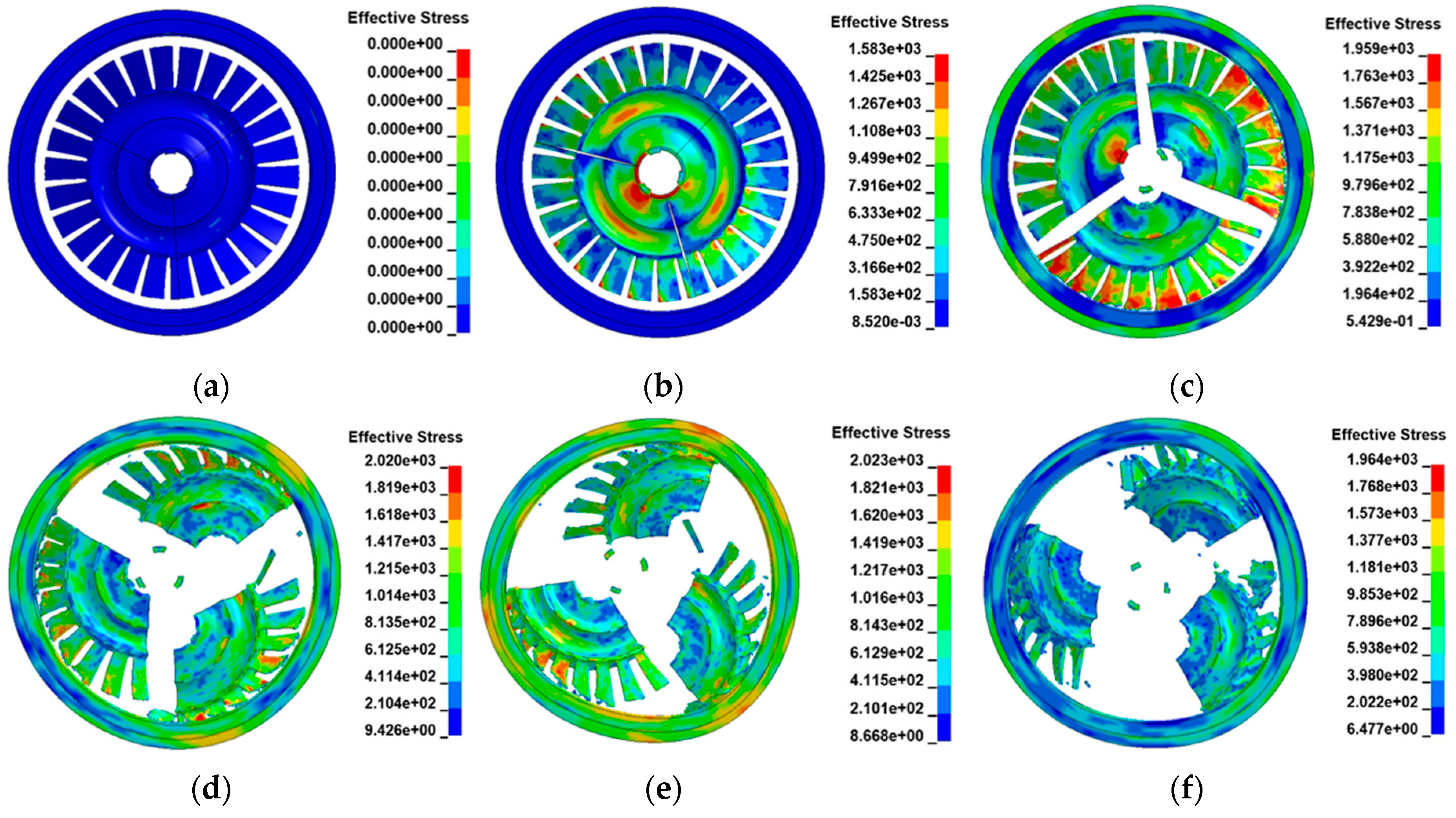 Figure 6 shows that at t = 0.03 ms, the turbine wheel begins to burst, and the turbine wheel pieces first impact the containment ring at t = 0.15 ms. During the entire impact process, the blades suffer severe bending or fracture damage; however, the containment ring is not broken. This implies that the containment ring has a sufficient containment ability.