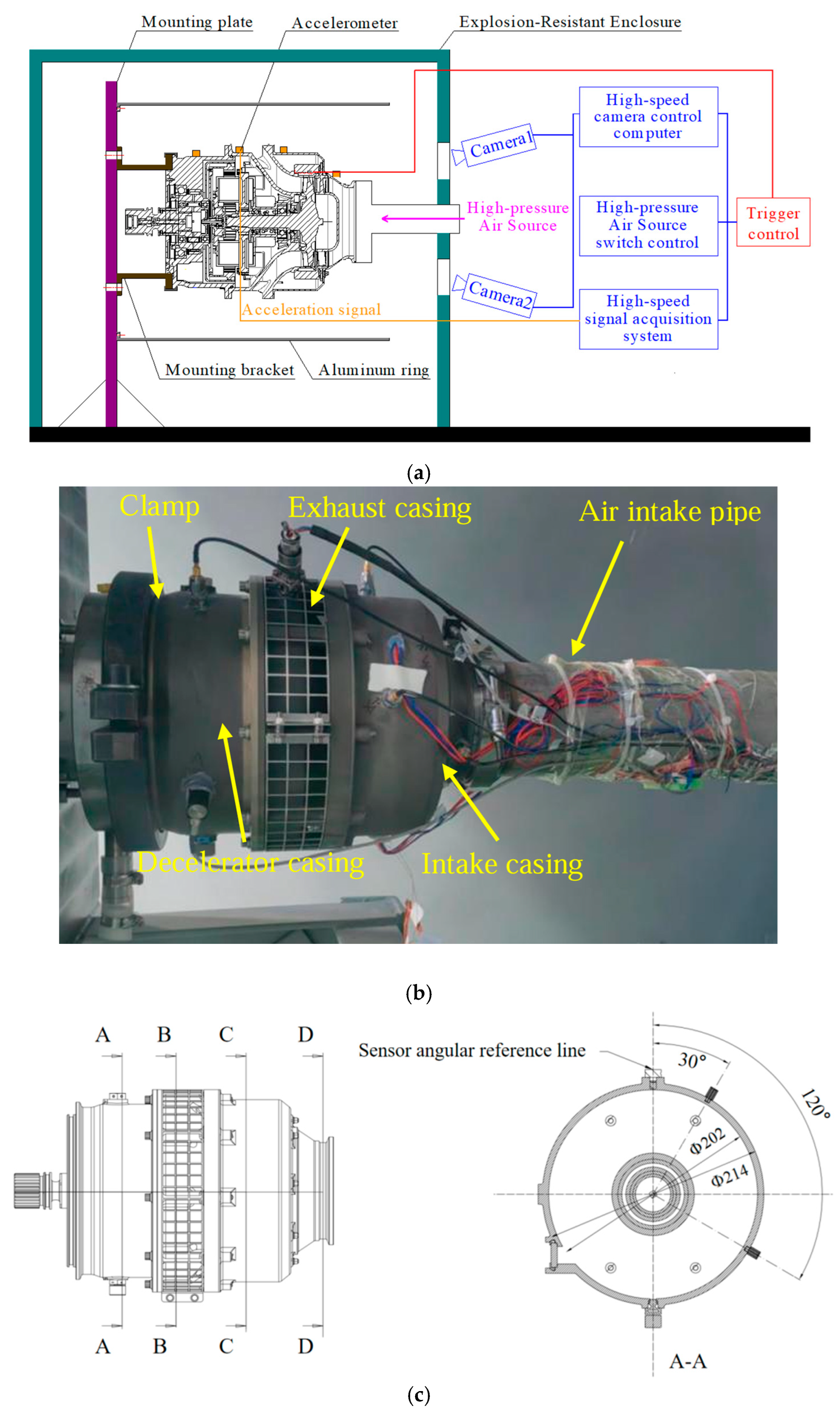 In summary, current domestic and international methods for evaluating the structural safety of Air Turbine Starters (ATS) primarily focus on localized components. However, due to the structural complexity of ATS, sudden high-energy loads impact not only the containment ring but also the entire turbine shaft system and planetary gear structure. Consequently, safety assessments that only consider partial ATS structures have inherent limitations. To address this limitation, this study proposes a comprehensive containment analysis method based on the full ATS structure. First, a finite element model (FEM) of the entire ATS structure was developed to assess its deformation characteristics and damage behavior. Subsequently, an aerodynamic test platform for the full ATS structure was established, and structural deformation and damage patterns at critical locations were used to validate the FEM. By integrating simulation and experimental results, this study further clarifies the transmission mechanisms and dynamic response characteristics of sudden high-energy loads. Ultimately, this research provides valuable technical references for both the structural design and safety evaluation of ATS.