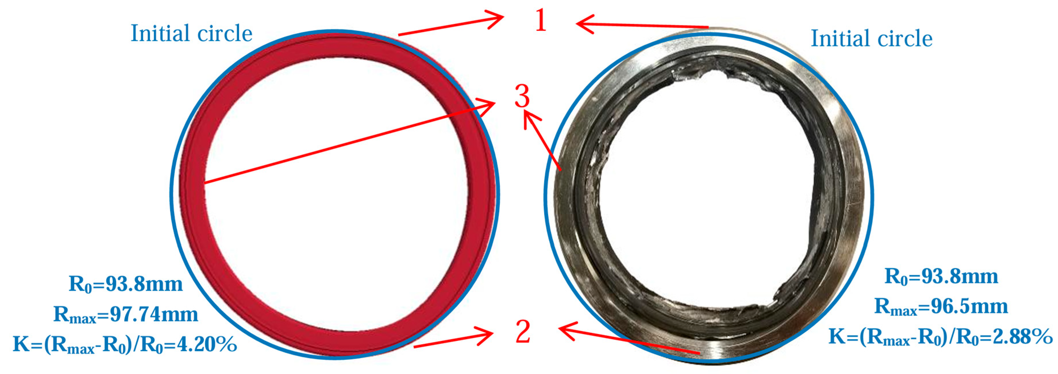 (1) This study successfully designed and implemented an ATS containment test and corresponding simulation analysis. A test bench was built for the test, where the turbine rotor was driven by airflow, and the turbine wheel was cut according to a predefined cutting plan to burst at the designed burst speed. Post-test observations showed that the containment ring underwent plastic deformation but remained unpierced. The turbine wheel pieces suffered impact damage: most blades were bent, twisted, or even detached, with only a few damaged blades remaining on the turbine wheel. The supporting bearings of the turbine shaft were damaged, and the planetary gears exhibited tooth surface wear and extrusion damage. These results confirm that the starter has excellent wheel-piece containment capability, and the experimental results are highly consistent with the simulation results.